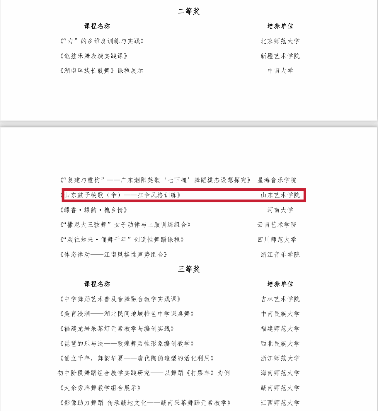 据悉,本届赛事共收到62所培养单位(含2所海外院校)报送的369个作品和课程,经过大赛专业委员会艺术学组评审委员会初评,舞蹈教育组别从107堂课程展示中选取45堂课程入围全国总决赛。本次获得舞蹈教育组别获奖的有23门课程,获“优秀组织奖”的有16所院校。
