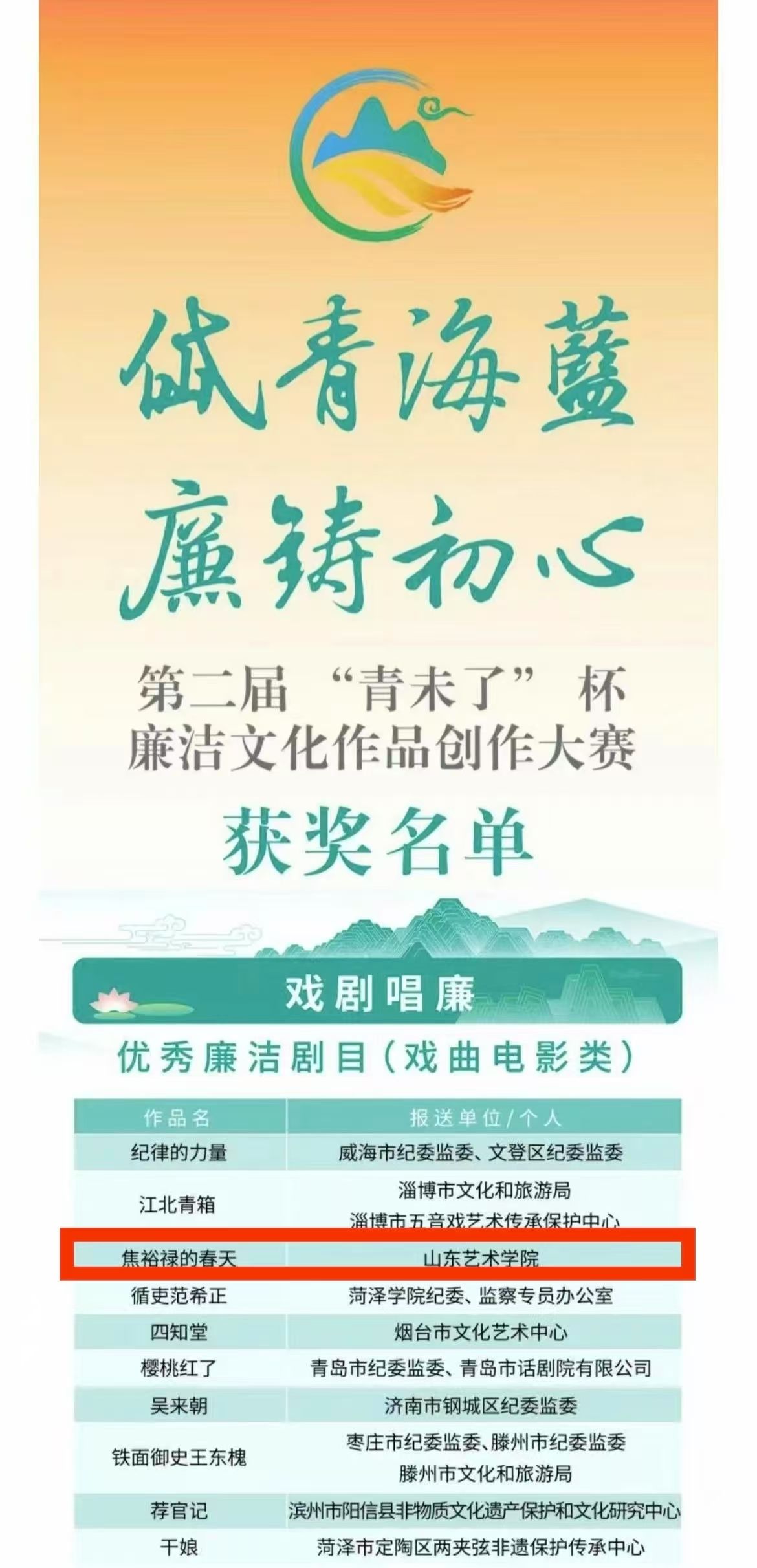 7月3日,第二届“青未了”杯廉洁文化优秀作品展示展演在济南举行,标志着第二届“青未了”杯廉洁文化作品创作大赛圆满落幕。beat365亚洲体育官方网站教师滕永山创作的以“人民公仆”焦裕禄为原型的舞剧《焦裕禄的春天》斩获戏曲电影类优秀廉洁剧目。