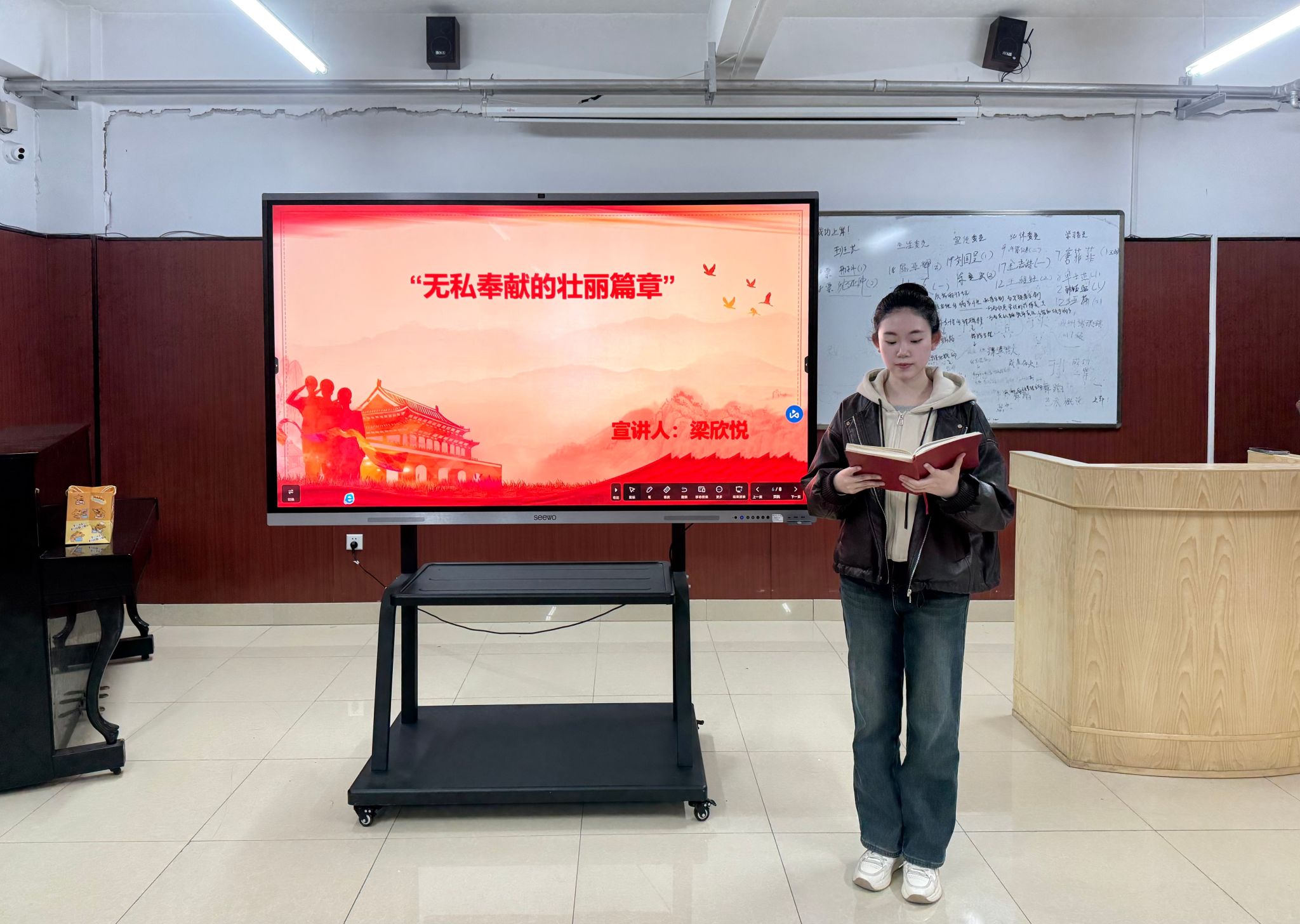 孔繁想同学为大家分享的宣讲主题是“传承雷锋精神,点亮时代灯塔”。她朗诵了雷锋同志日记本中的一段话.:“如果你是一滴水,你是否滋润了一寸土地?如果你是一线阳光,你是否照亮了一分黑暗?”这段话质朴而又充满力量,深深触动了她的内心。
