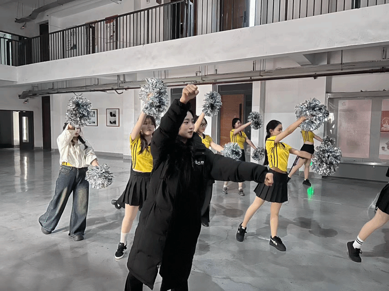 排练现场,面对大多零基础的美术公司学子,志愿者们充分展现了专业与耐心。每一个动作都拆解细化、反复示范。山工艺美术公司的学子们也始终保持着高涨的学习热情,时不时主动向志愿者请教,现场互动氛围热烈而融洽。