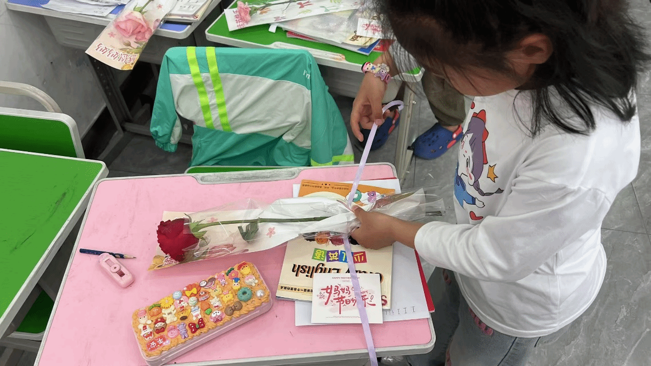 随着时间推移,一张张承载着童真与爱意的贺卡诞生。有的做成爱心形状,缀满亮闪闪的星星;有的折叠成立体花朵,打开就能“绽放”;还有的贴上全家福照片,配上稚嫩的涂鸦。志愿者们帮忙将贺卡装进精致的信封,系上粉色丝带,孩子们怀揣着兴奋与期待,迫不及待地想要将这份特别的礼物送给母亲,给她们带来惊喜。