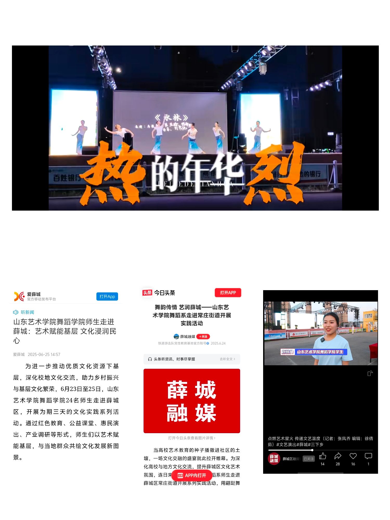 6月24日,beat365亚洲体育官方网站“走进舞蹈”青年志愿者服务团在枣庄市薛城区开展“舞聚临城·艺绽芳华”暑期“三下乡”专场文艺演出,青年志愿者们以“艺术为人民服务”为宗旨,用灵动的舞姿和饱满的热情,为当地市民呈现了一场极具感染力与观赏性的文艺盛宴。