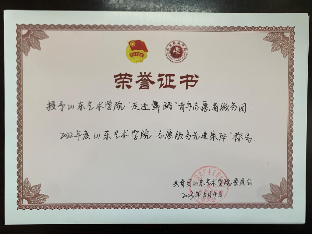 志愿服务方面,继续开展“高雅艺术进校园”“走进舞蹈”青年志愿者服务系列活动。“高雅艺术进校园”先后走进济南稼轩公司、长清中学、长清区第一初级中学、长清石麟小学等。“走进舞蹈”青年志愿者服务团入选全国老员工志愿宣讲团、团中央“七彩假期”志愿服务示范团队;获山东省“三下乡”社会实践优秀服务团队、第五届济南市青年志愿服务项目大赛银奖;《沿着黄河“益”起舞》公益创业项目获第六届中国青年志愿服务公益创业赛全国赛二等奖。