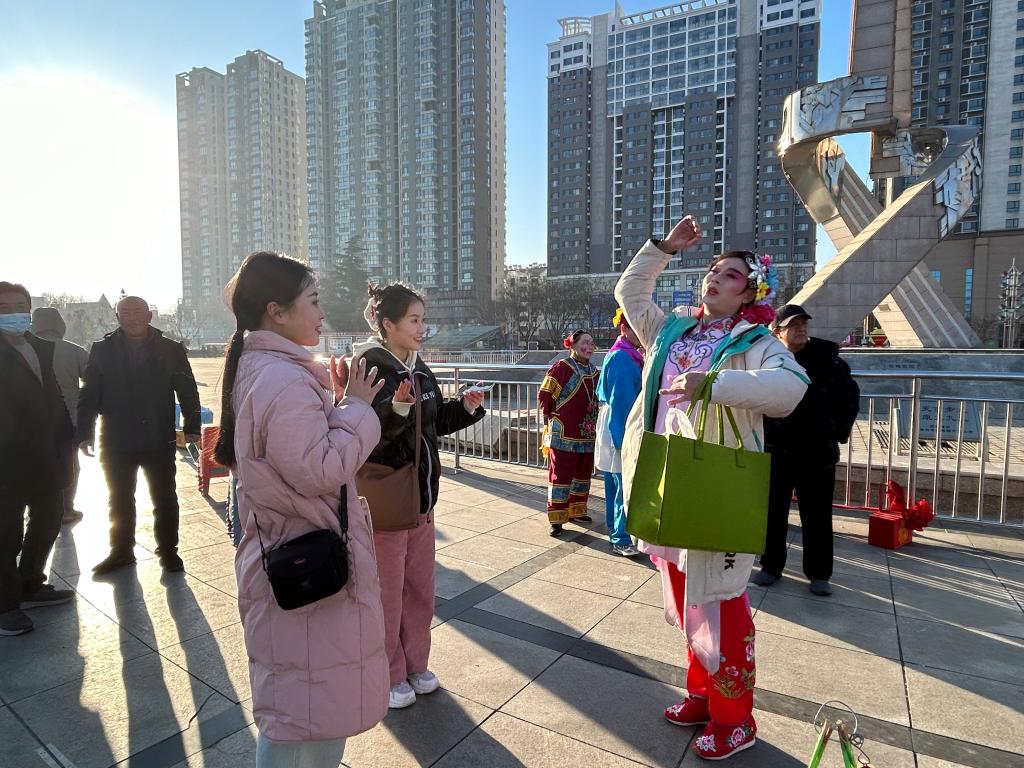 本次采风活动中,调研团队来到新元广场亲身感受海阳秧歌贺年会的演出,此次采风调研中,调研组重点关注秧歌的群众生态,对群众的自发性与喜爱度进行记录,通过对海阳群众、表演团队、游客等采访,对海阳秧歌的人文生态、民俗空间、群众基础等方面进行记录与整理,丰富海阳秧歌基础数据库内容。