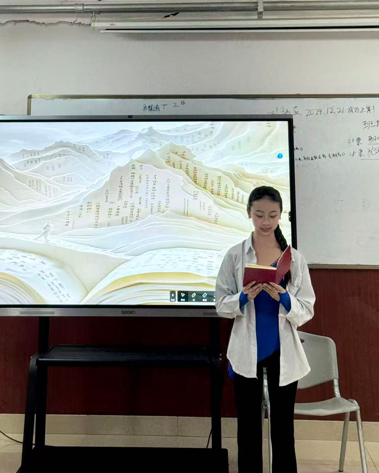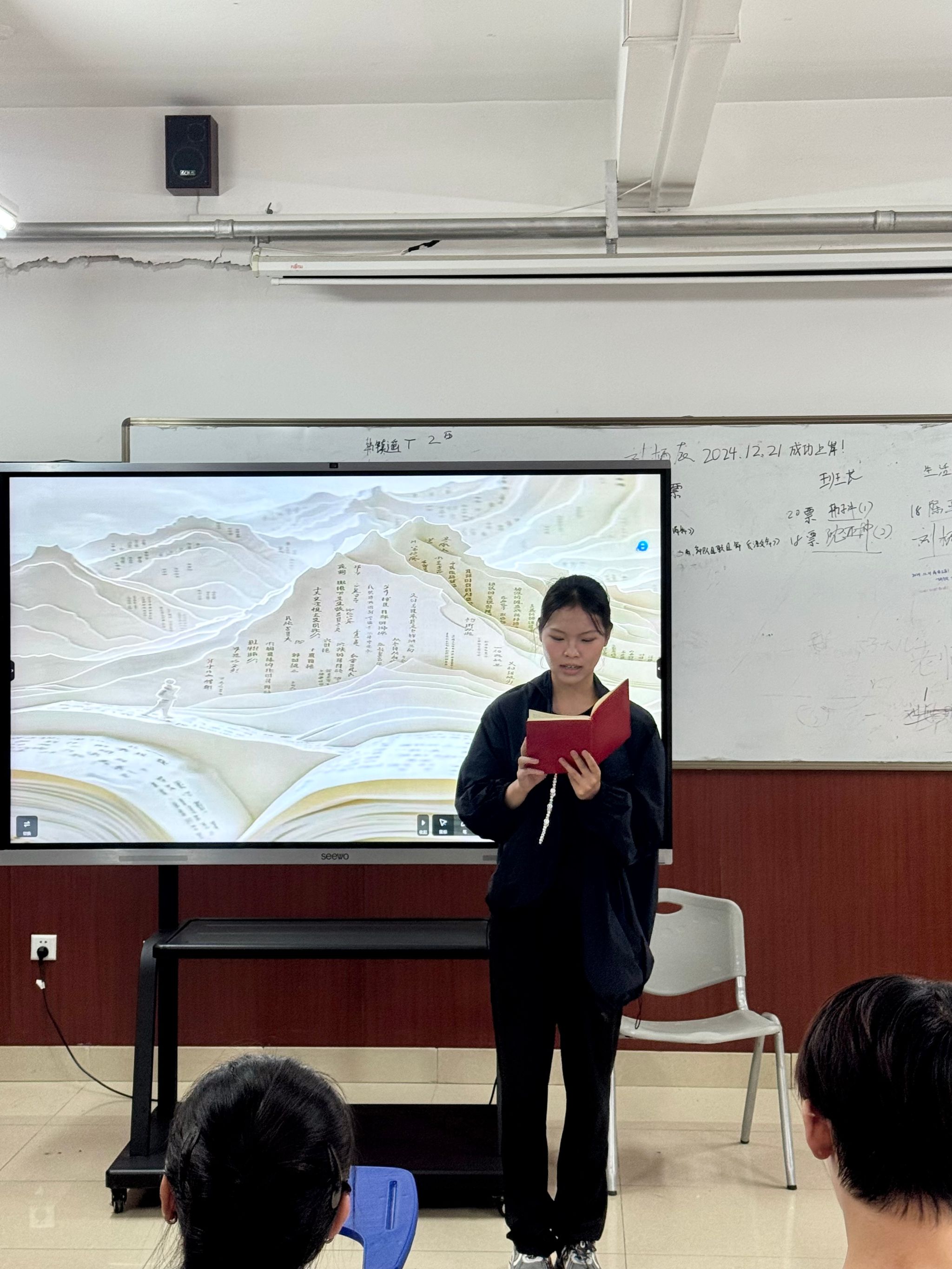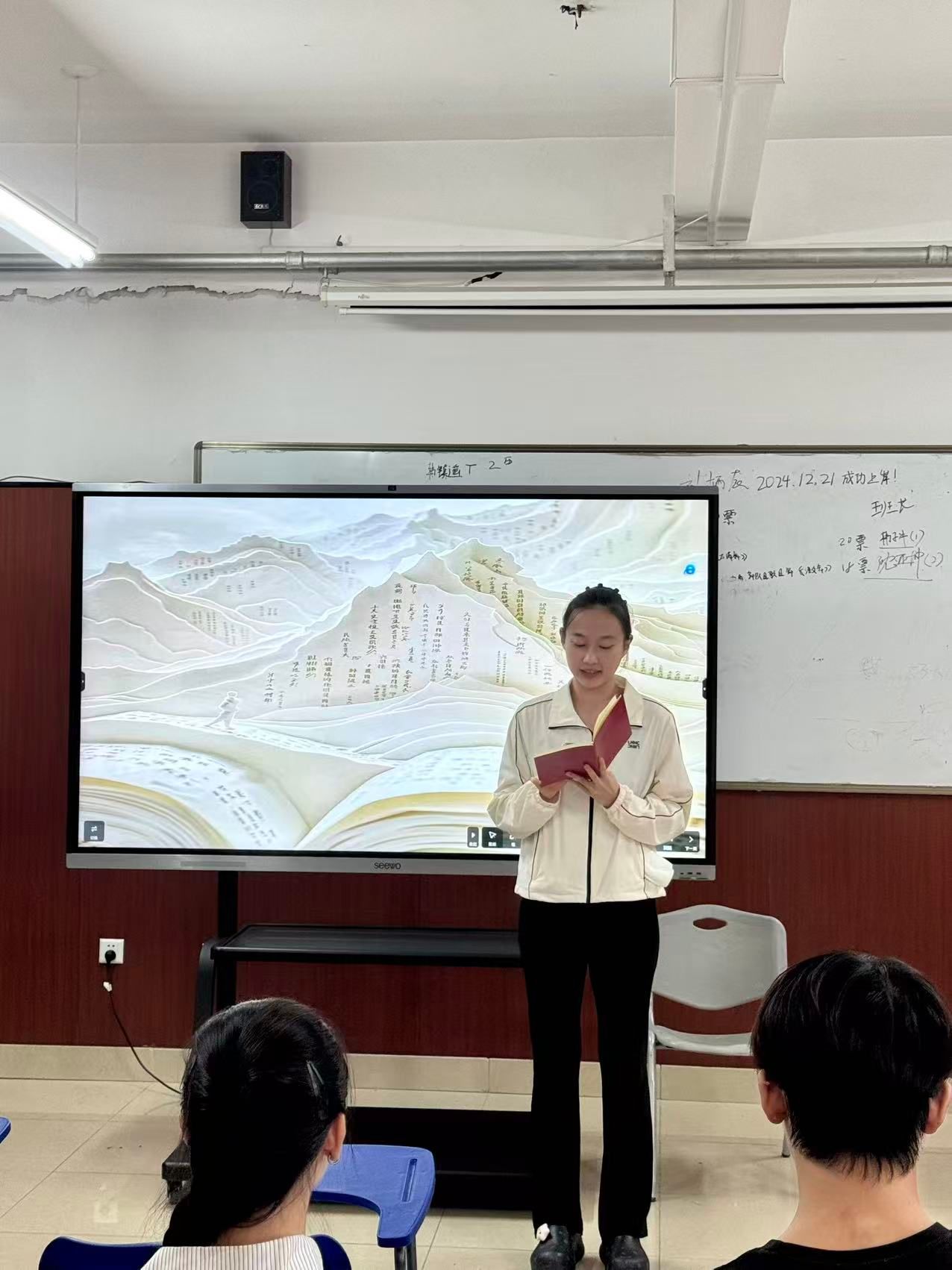 本次活动由吴笛同学主持。她以张桂梅老师“一盏明灯”般的感人事迹为引,深情讲述了华坪女高的故事,引发了同学们的深刻思考与讨论。随后,多位同学结合经典教育理念与榜样事迹,分享对教育家精神的理解与感悟。