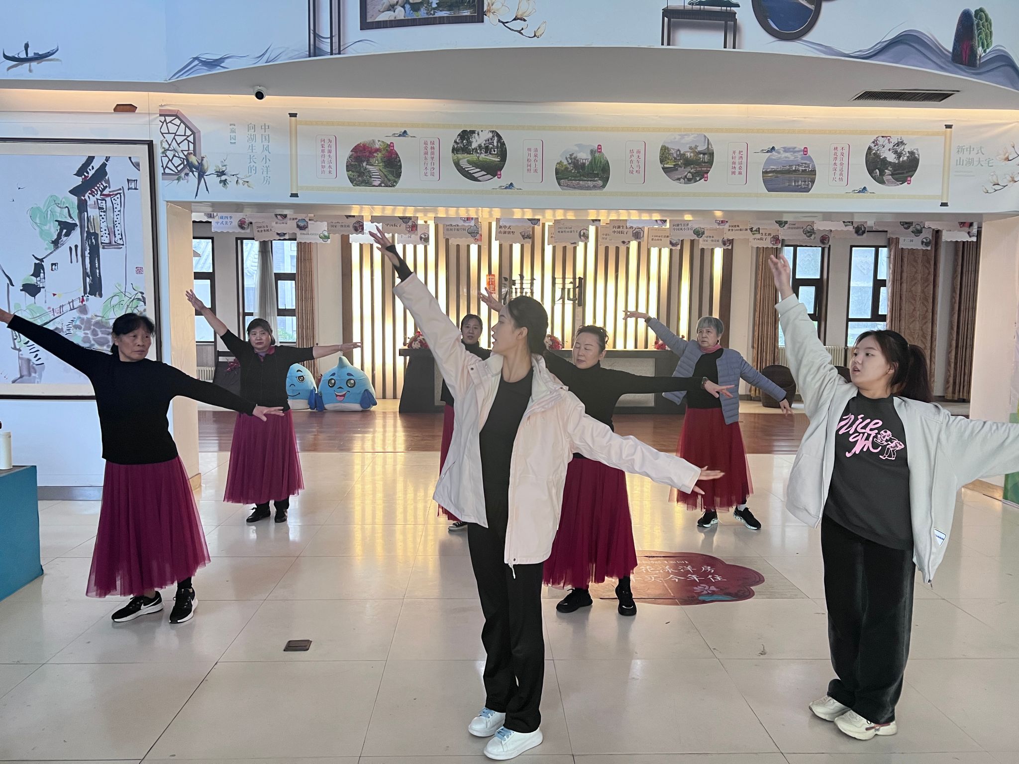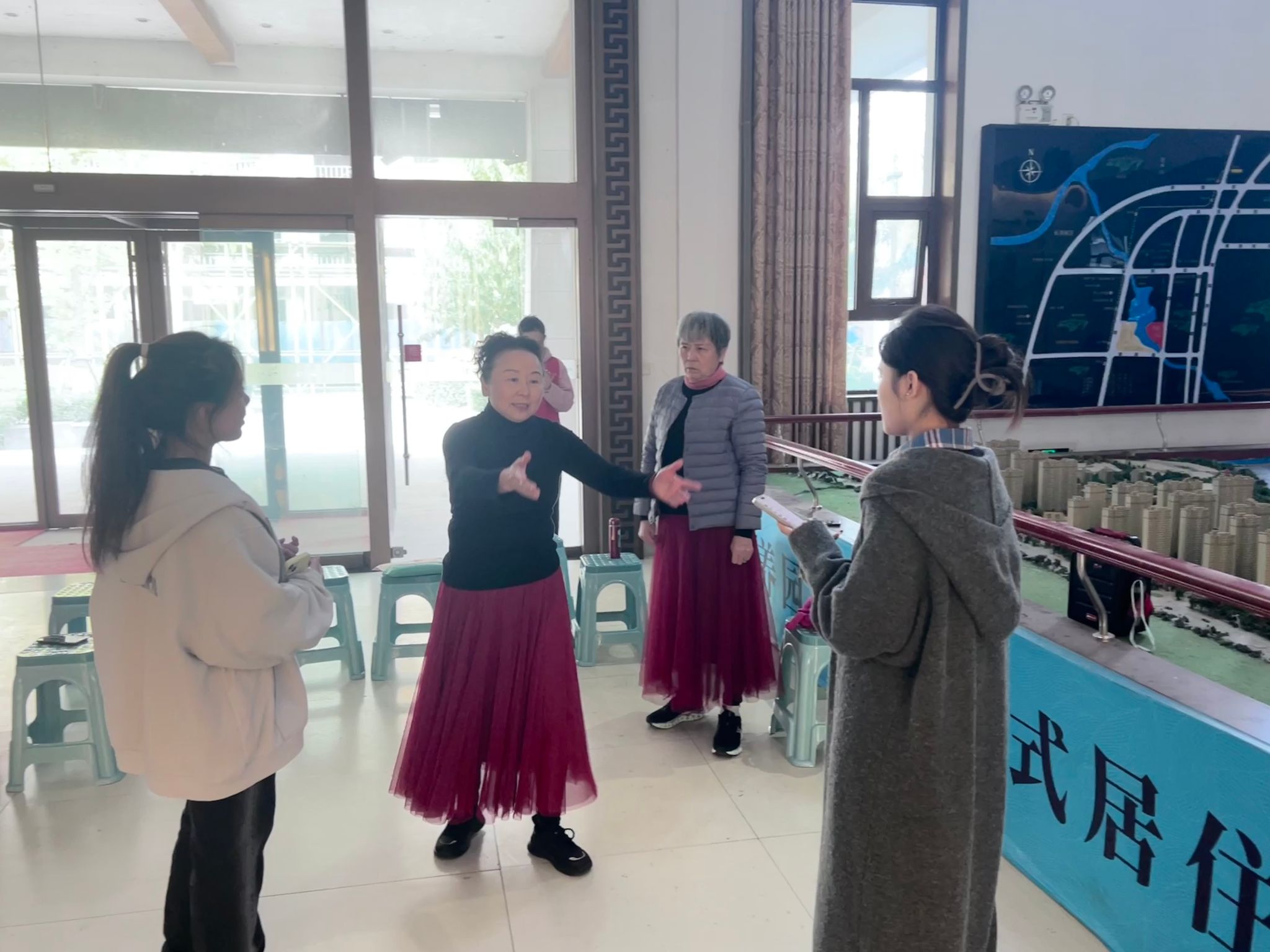 此后进入了教学环节,本次的教学节目为《扬帆起航》志愿者们以认真饱满的态度,迅速投入到教学当中。在过程中青年志愿者们处处透露着专业与热情,也让居民们感受到舞蹈的独特魅力,小到一个表情,大到整体的队形变化,居民们在青年志愿者的带领下展现了良好的精神风貌。