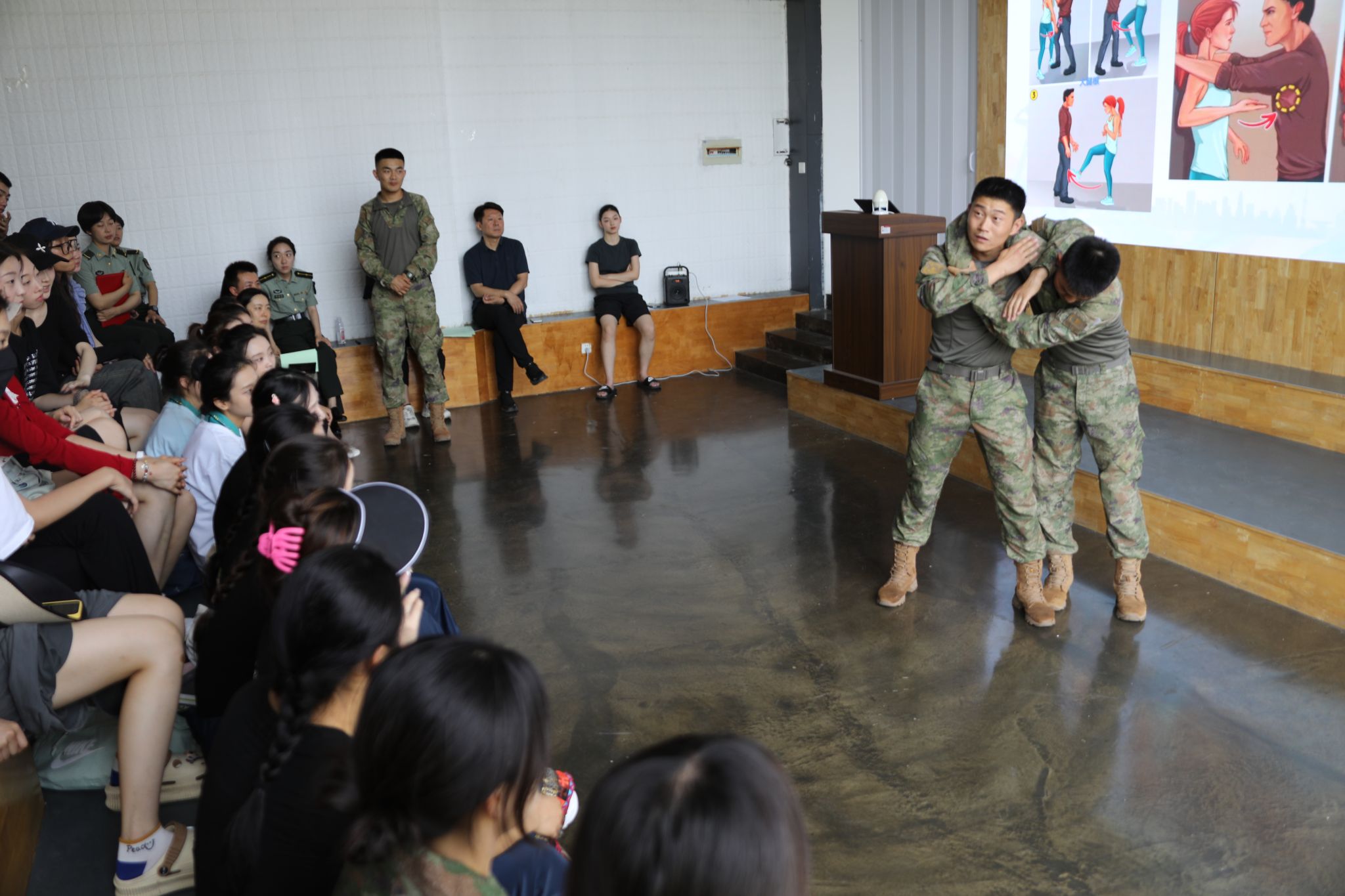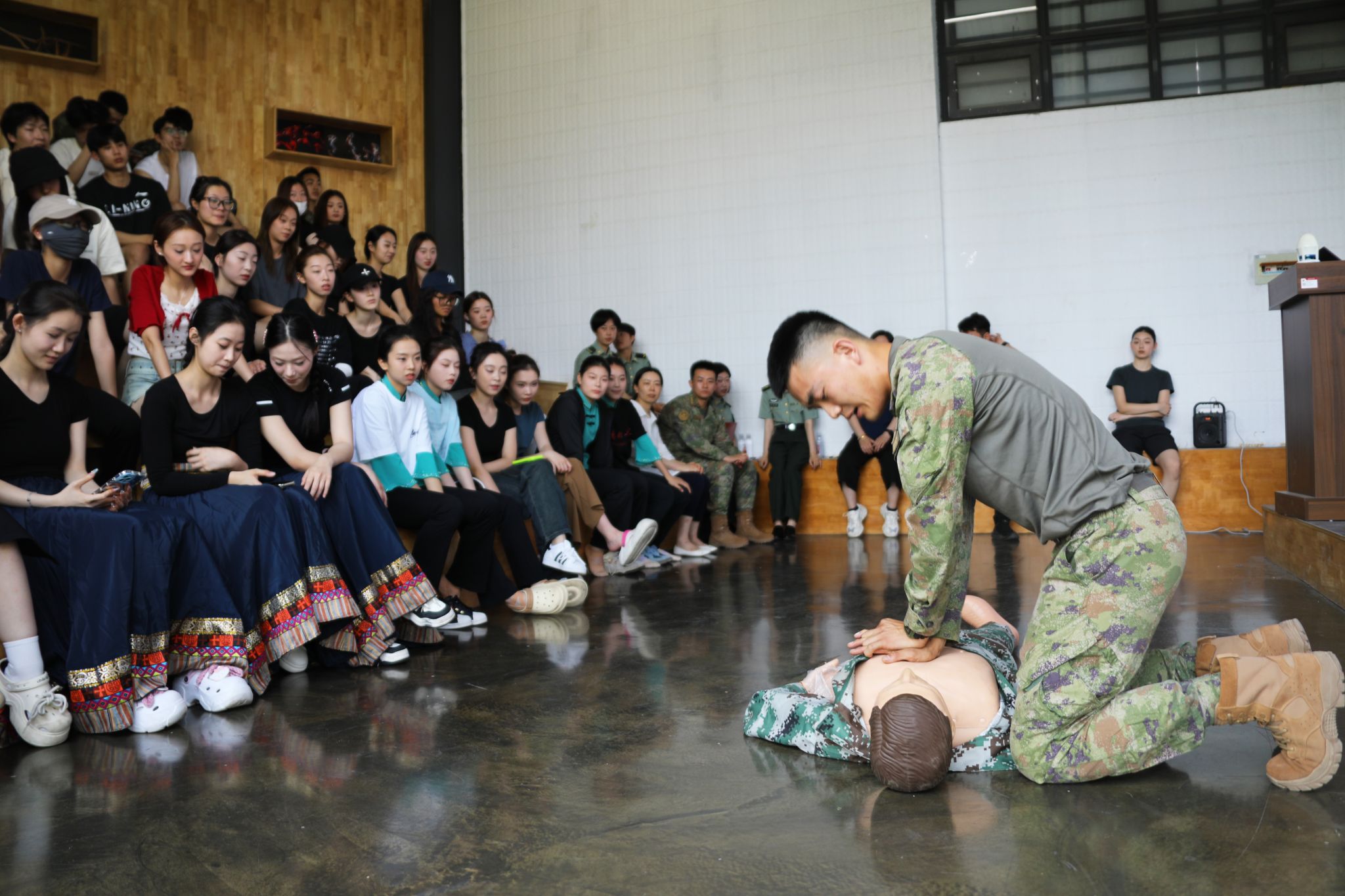 “在面对紧急情况时,自救互救可以帮助我们和他人最大限度地减少伤害并等待救援……”宣讲结束后,部队官兵代表进行了自救互救、国旗护卫队队列、防身术等科目展示,官兵们为同学们演示介绍了海姆立克急救法、心肺复苏、就便器材自救等急救方法,展示了国旗护卫队仪仗队队列、女子防身术等。现场气氛热烈,同学们在寓教于乐的氛围中学习到了自我防护的知识。