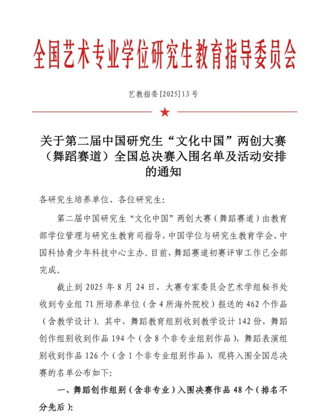近日,全国艺术专业学位研究生教育指导委员会正式发布《关于第二届中国研究生“文化中国”两创大赛(舞...